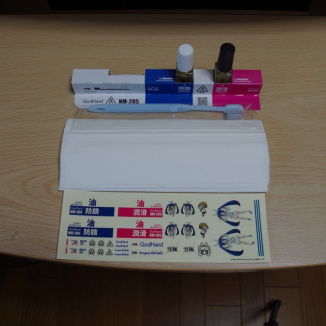 プラカス取り用のブラシ+潤滑油+防錆油+キムタオル+ステッカー。