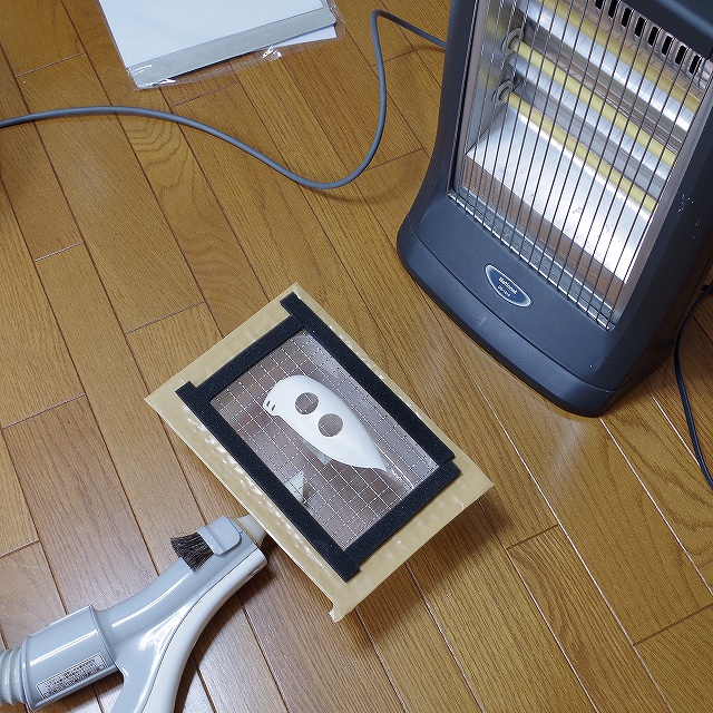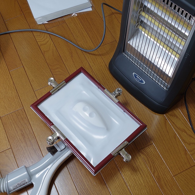 100均じゃないけどウチに在った電熱ヒーターでプラ版を熱して