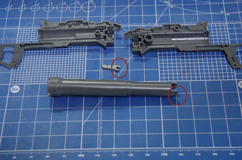 ライフルの本体、銃身とバズーカの本体、マガジンに合わせ目が目立ちます。