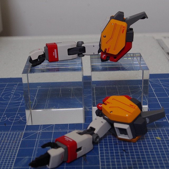 腕部にもありますが、四角いダクト(スラスター)は全て薄く加工しています。
