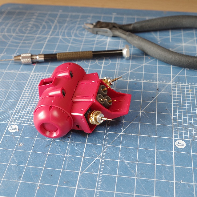小さいスラスターは穴開けてソケットピンでディティール追加です。